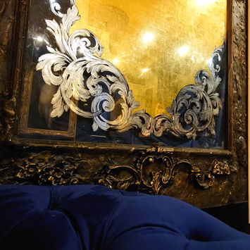 In some of our projects, we left some parts of the glass untreated and not gilded to reveal the fine fabric behind the whole main gilded composition